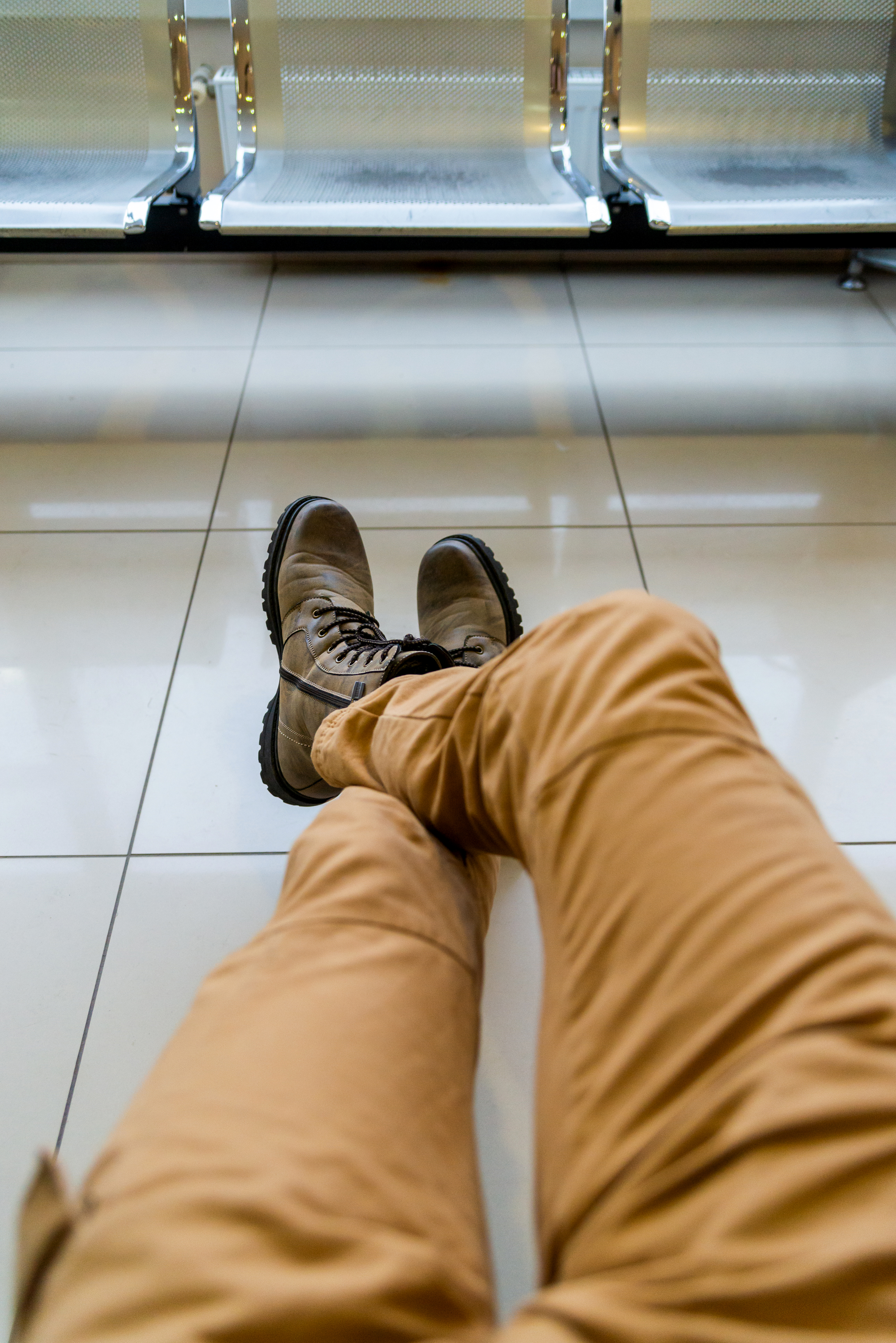 The floor is laid with large, light beige tiles, creating a sense of cleanliness and spaciousness. The tile lines, receding from the viewer, add depth and perspective to the composition. In the background, rows of modern metal seats, characteristic of airports, train stations, or other public waiting areas, are visible. Their minimalist design and the cold sheen of the metal contrast with the warmer tones of the clothing and floor.
