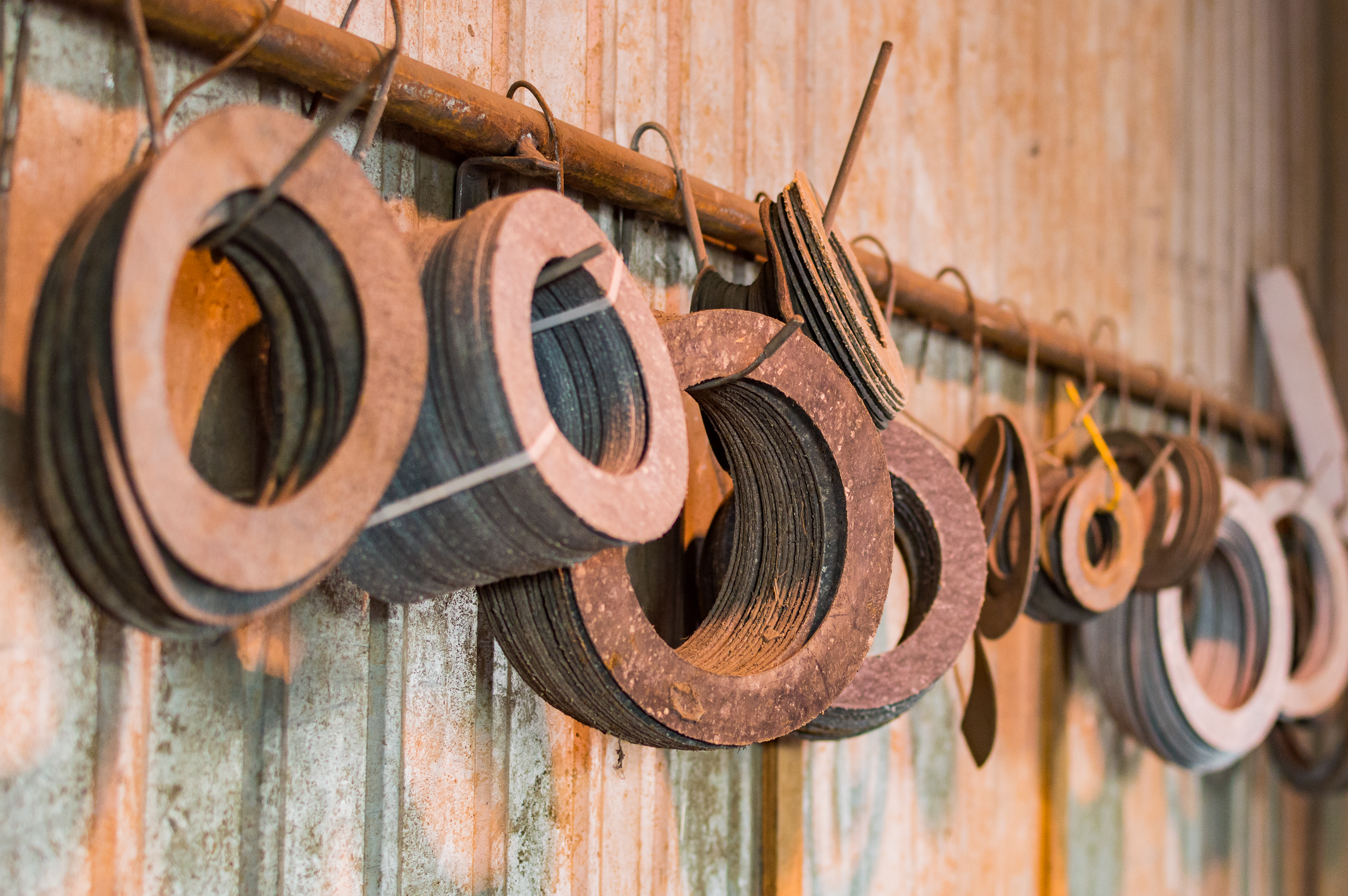 Композиция кадра построена таким образом, чтобы акцентировать внимание на самих прокладках, располагая их вдоль горизонтальной линии, что создает ощущение порядка и систематизации. Взгляд зрителя естественным образом следует вдоль ряда, исследуя каждую отдельную деталь. Это фото отлично подойдет для иллюстрации тем, связанных с производством, инженерией, механикой, ремонтом или хранением промышленных компонентов.