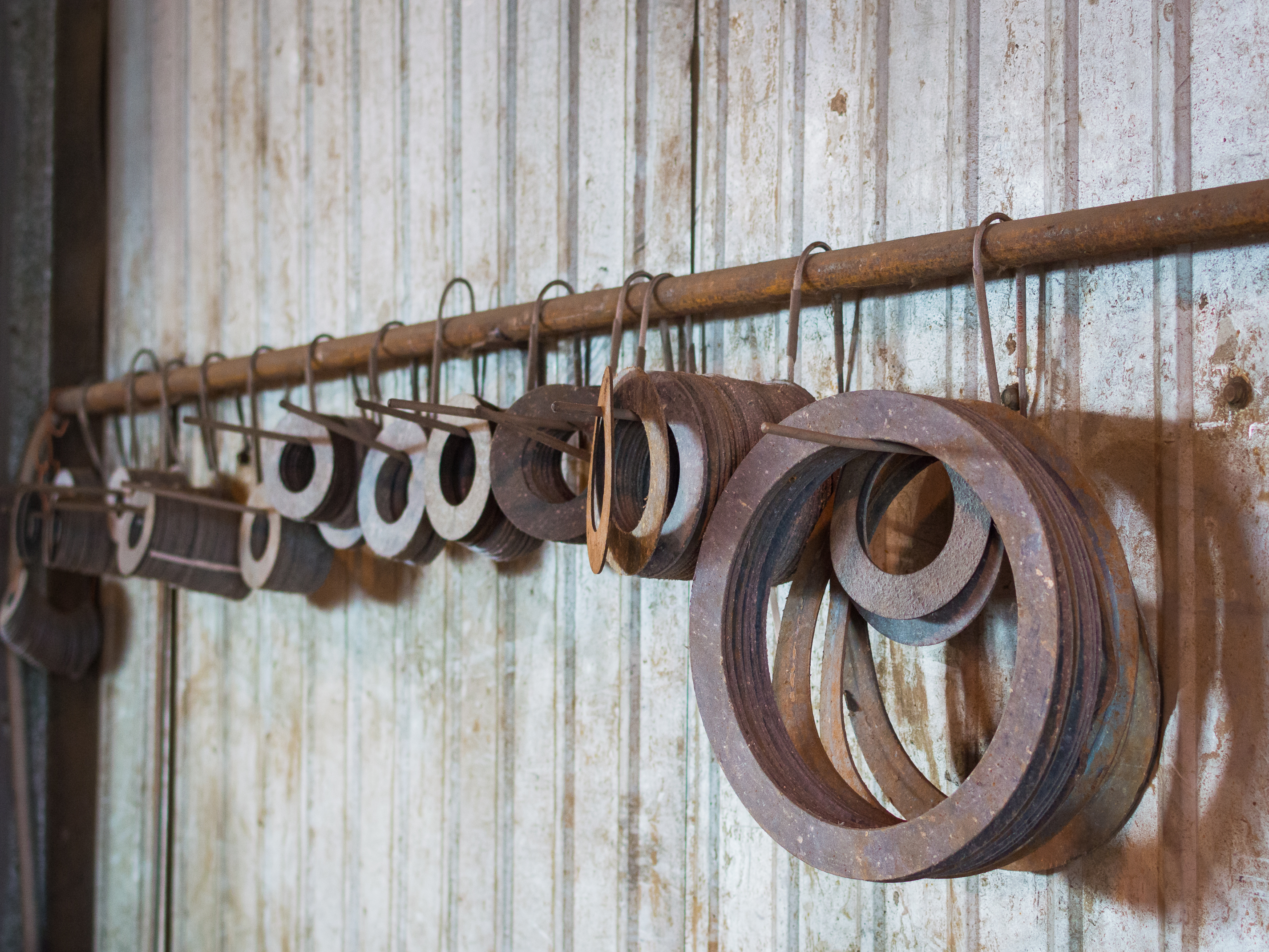Дальше по стене ряд более мелких колец и прокладок, также подвешенных на крючках. Их разнообразие по размеру и форме говорит о многообразии применений, для которых они были предназначены. Цветовая палитра изображения сдержанная, преобладают оттенки коричневого, серого и землистого, создавая ощущение индустриальности и утилитарности.