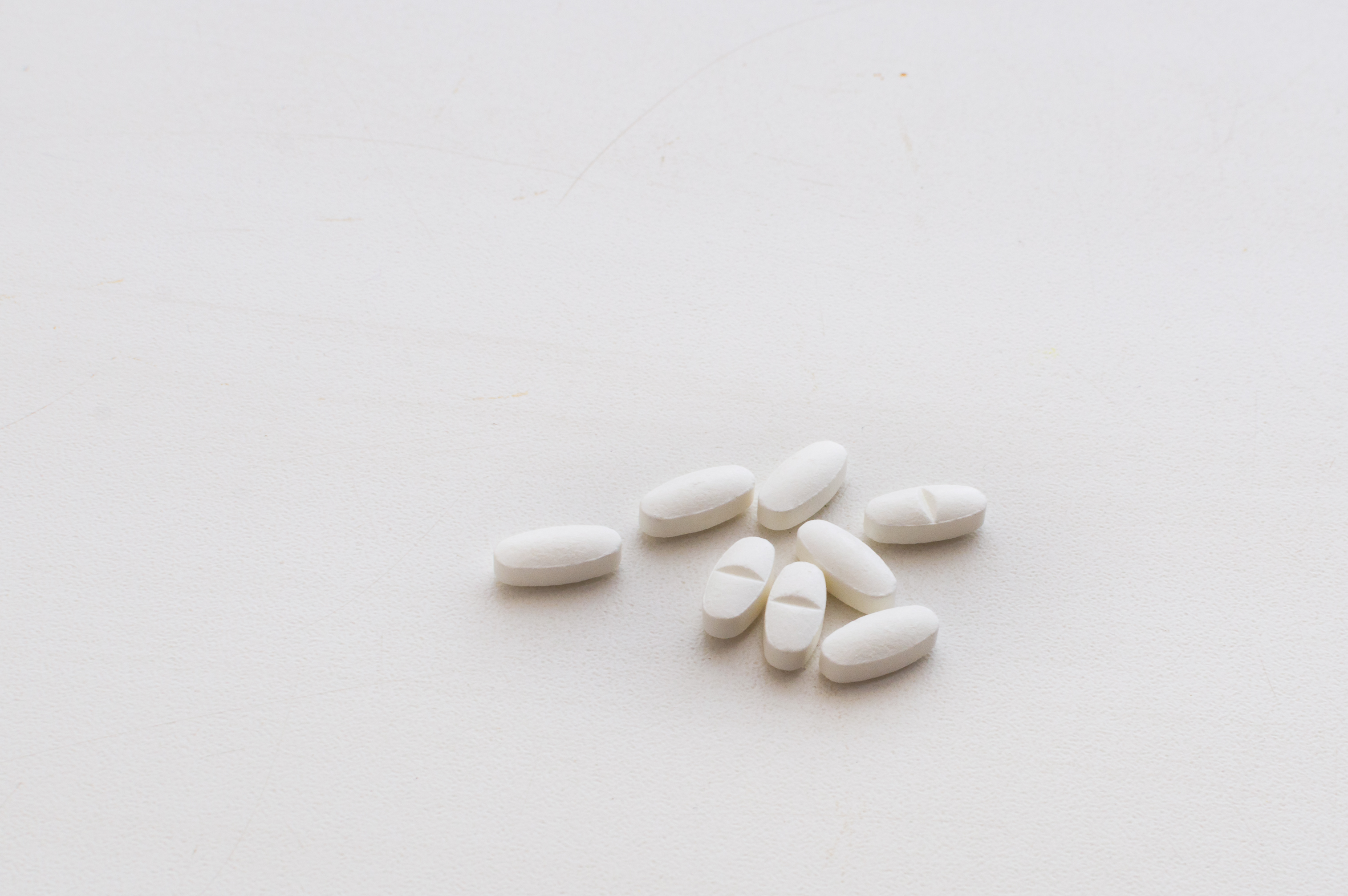 Это изображение представляет собой минималистичную композицию, центром которой являются несколько белых овальных таблеток. Таблетки расположены на гладком, светлом фоне, который может быть поверхностью стола или другой нейтральной плоскостью. Освещение мягкое, что подчеркивает форму и текстуру таблеток, создавая ощущение чистоты и стерильности.