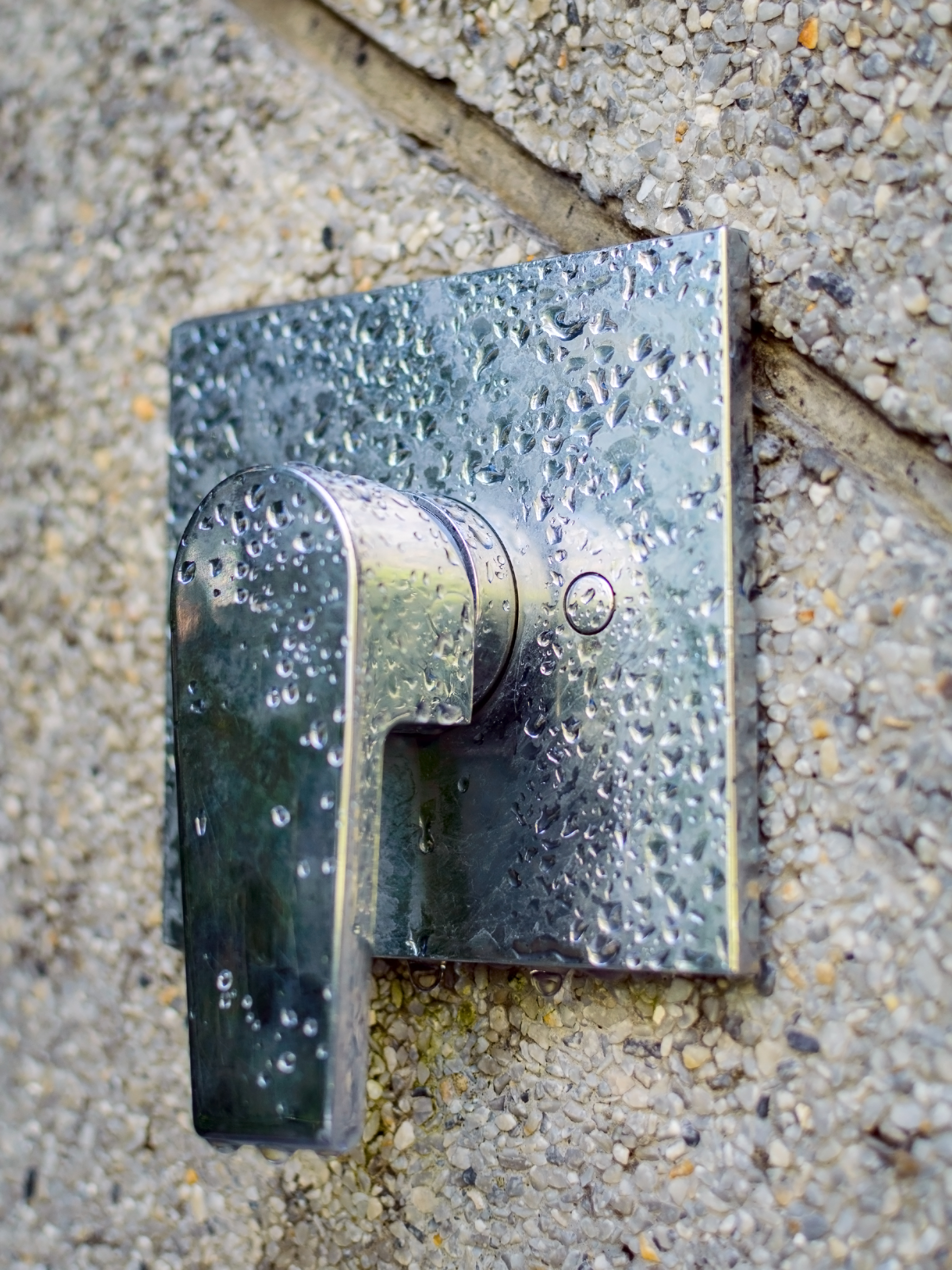 Shower tap faucet in chrome on stone wall. Water drops on metal.