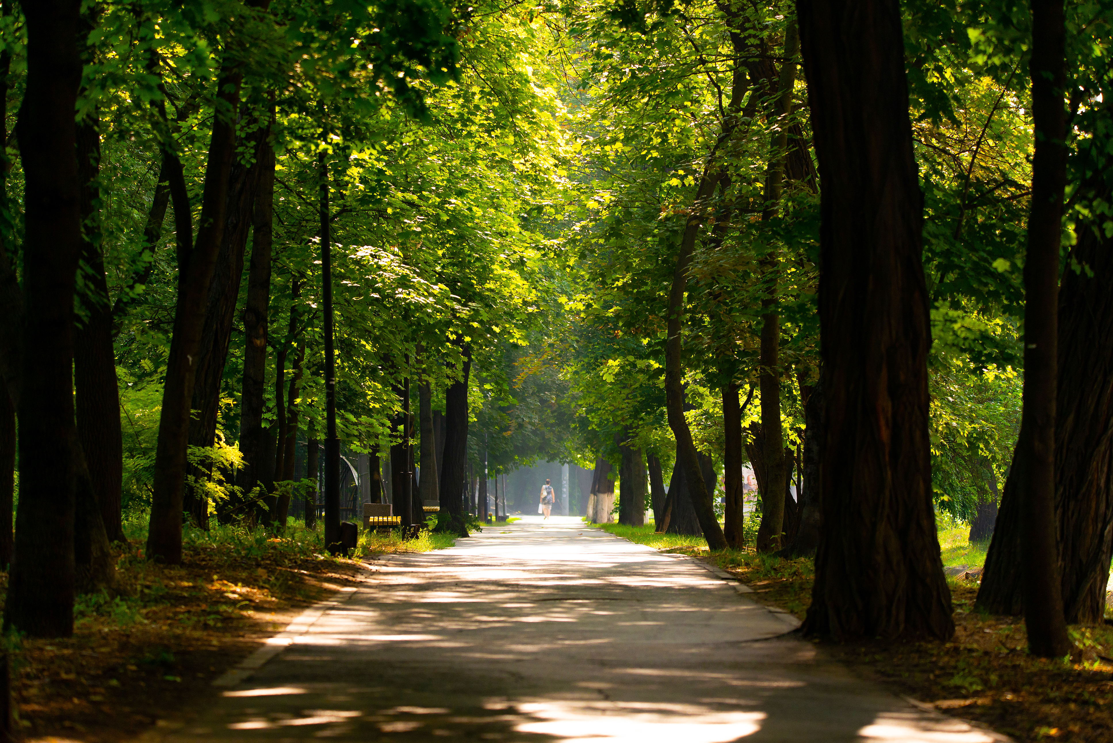Пешеходная дорожка с зелеными деревьями в городском парке. Красивая аллея в парке.