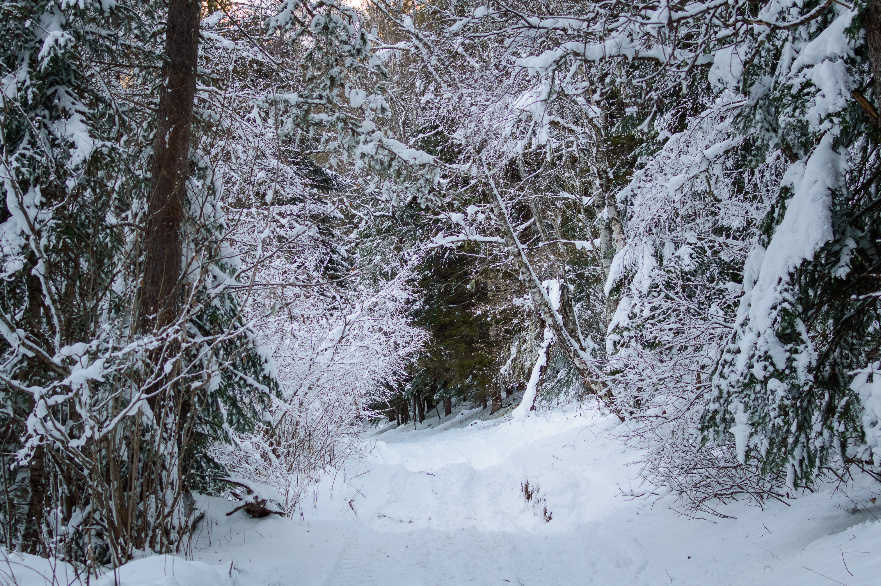 Заснеженная лесная тропинка, укрытая пушистым снегом, манит вглубь зимнего леса. Ветви деревьев покрыты инеем, создавая сказочную атмосферу.
