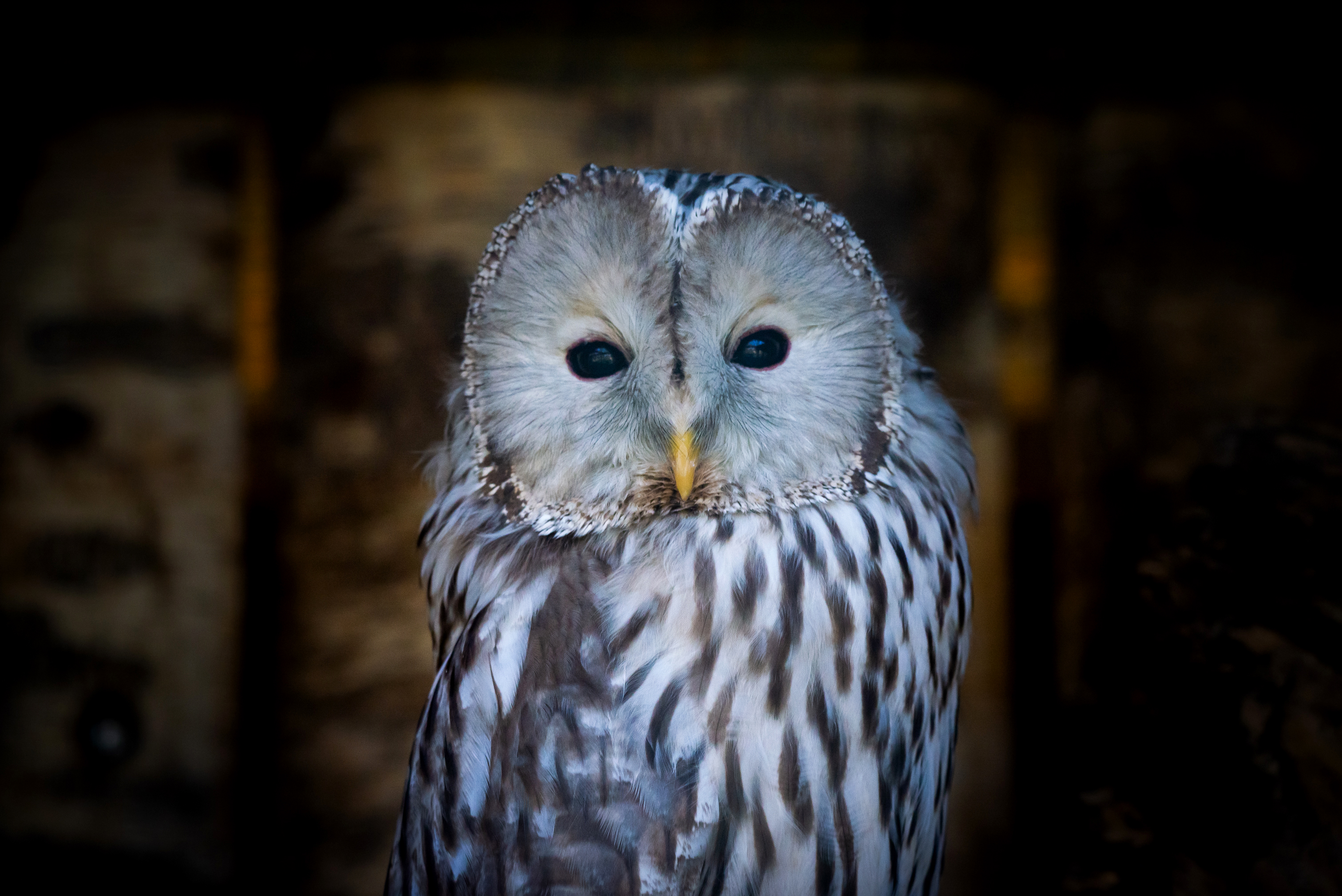 The background of the image is intentionally darkened, which enhances the focus on the owl and creates an atmosphere of mystery and solitude. The blurred silhouettes of trees or logs in the background hint at the bird's natural habitat – a quiet, dark forest where it reigns supreme.
