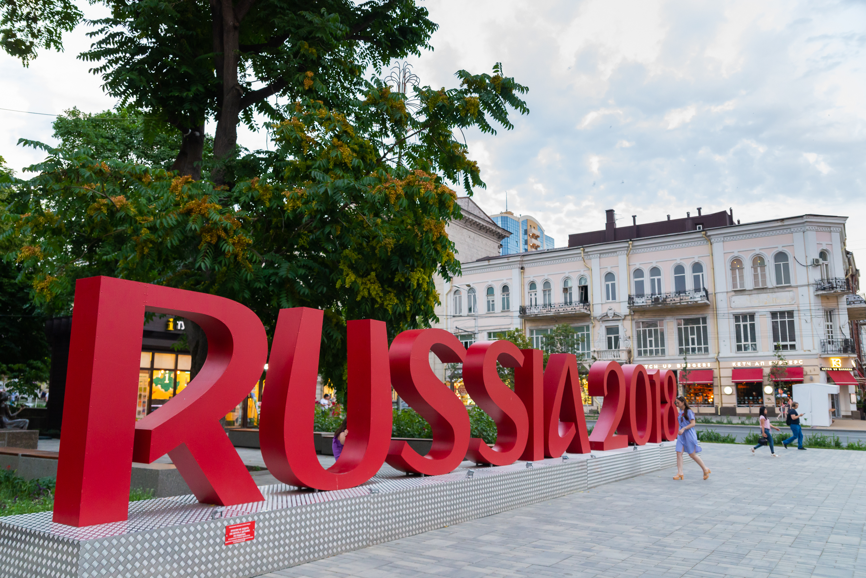 Яркая и запоминающаяся инсталляция в виде объемных красных букв «Россия 2018» украшает центр города Ростова-на-Дону. Надпись, установленная на специально подготовленном подиуме с геометрическим рисунком, привлекает внимание прохожих и создает атмосферу праздника, связанного с проведением Чемпионата мира по футболу.