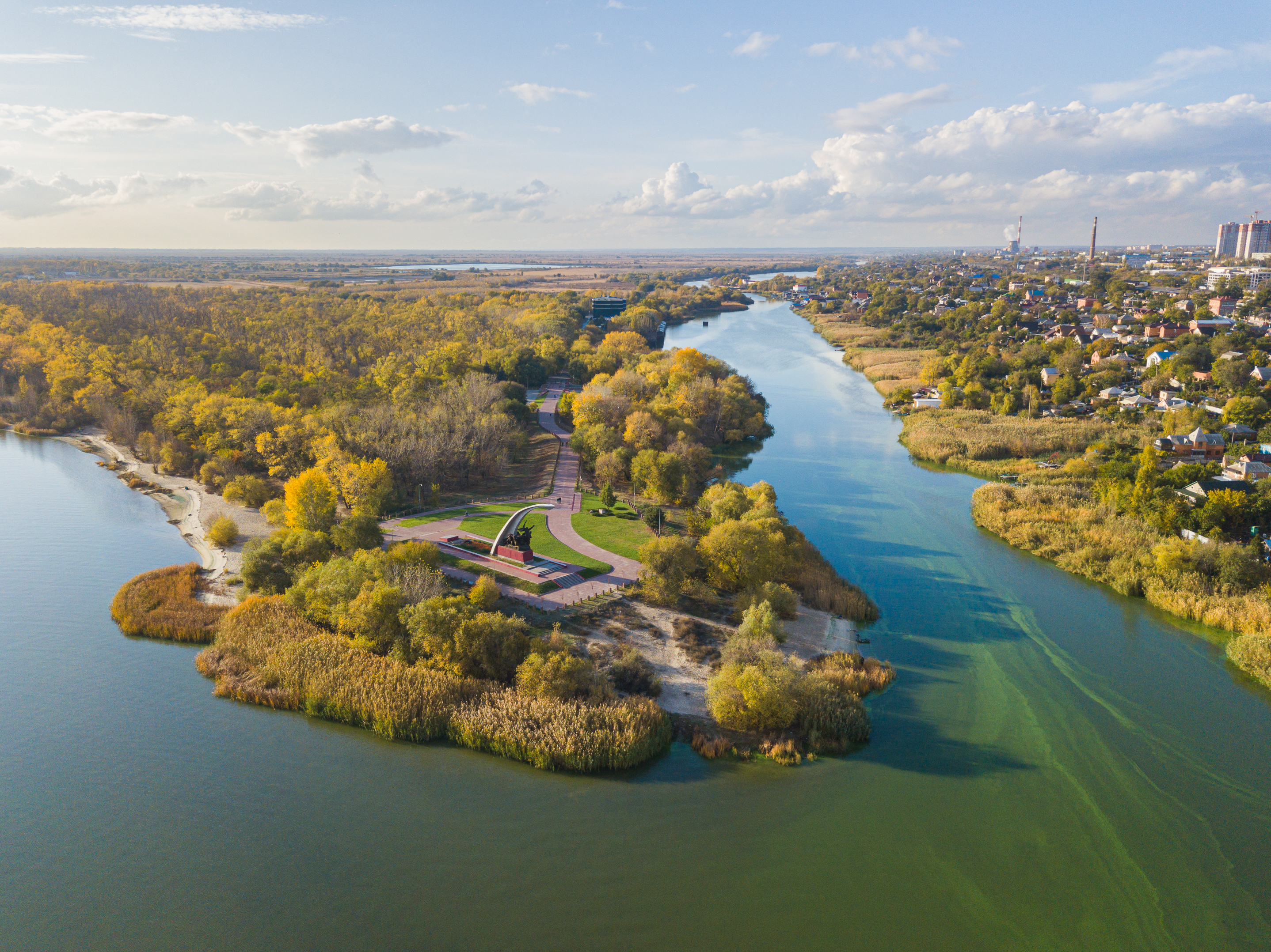 Далее, вдали, просматривается городская застройка Ростова, с характерными домами и высотными зданиями, контрастирующими с природным ландшафтом. Небо чистое, с легкими облаками, что говорит о приятной, прохладной погоде, типичной для начала ноября.