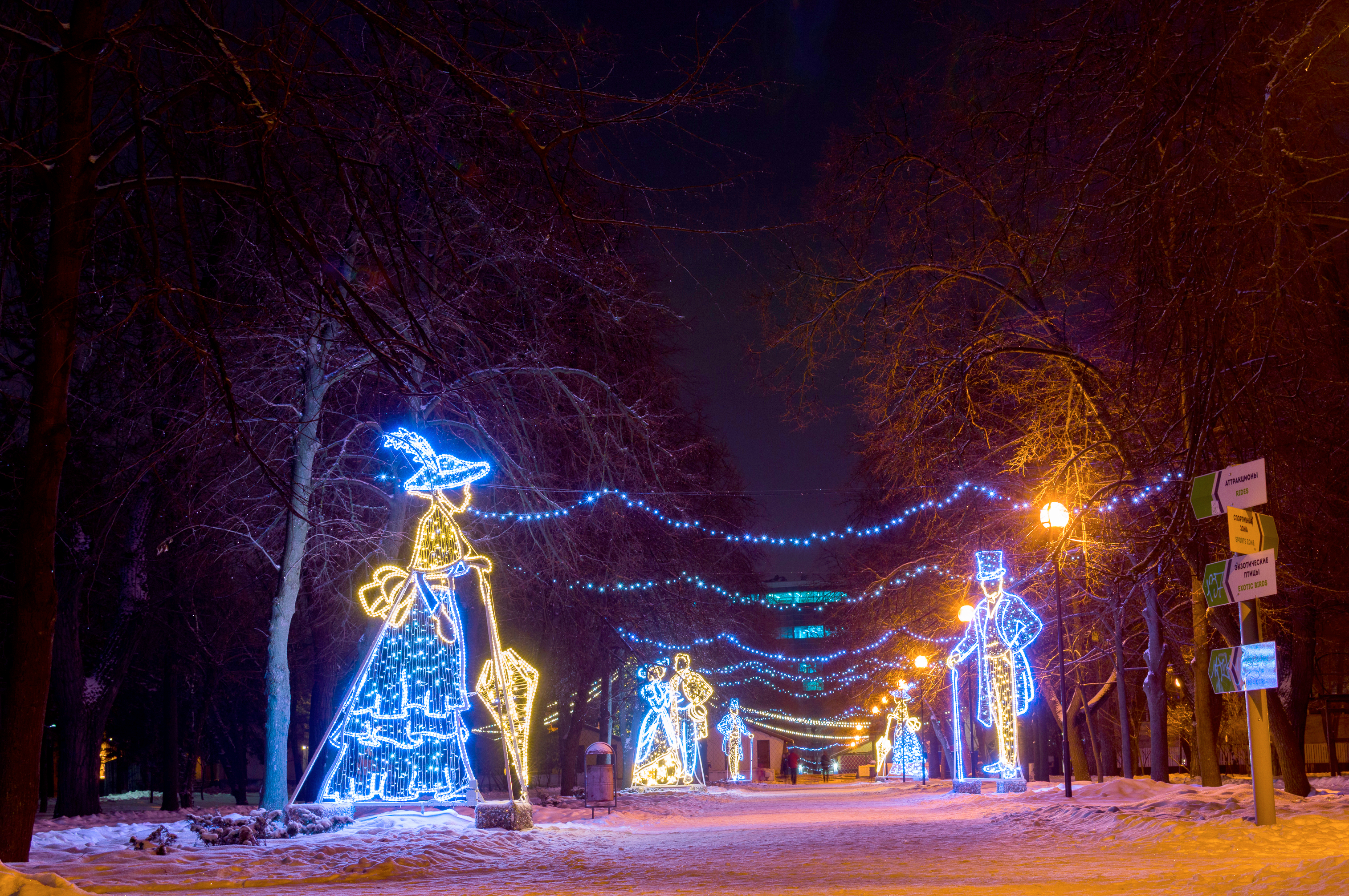 Основное освещение исходит от гирлянд и самих фигур, выполненных в виде людей в старинных костюмах. Яркий синий и желтый свет контрастирует с глубокой темнотой ночного неба и снежным покровом, покрывающим землю. Деревья, лишенные листвы, своими голыми ветвями создают графичный узор на фоне освещенной аллеи.