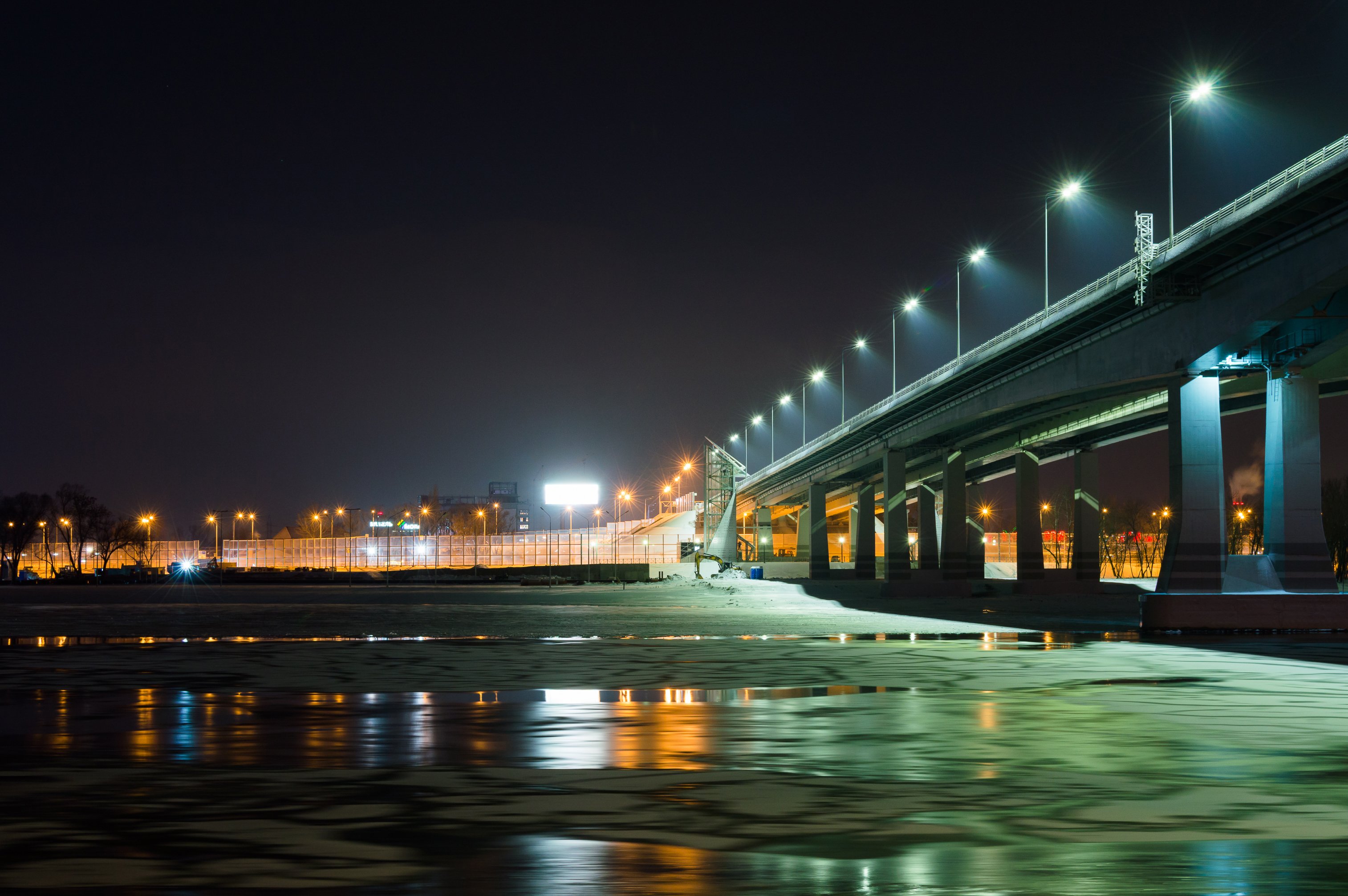 Ночной вид на освещенный мост над рекой Дон в Ростове-на-Дону в России.