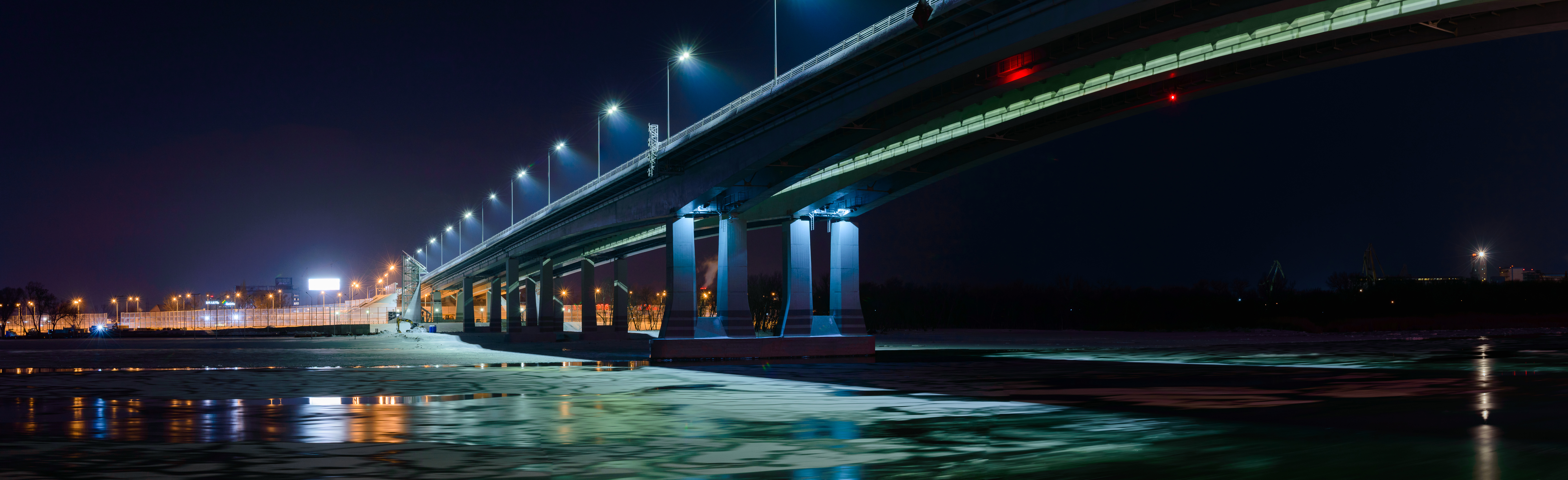 Ночной вид на освещенный мост над рекой Дон в Ростове-на-Дону в России.