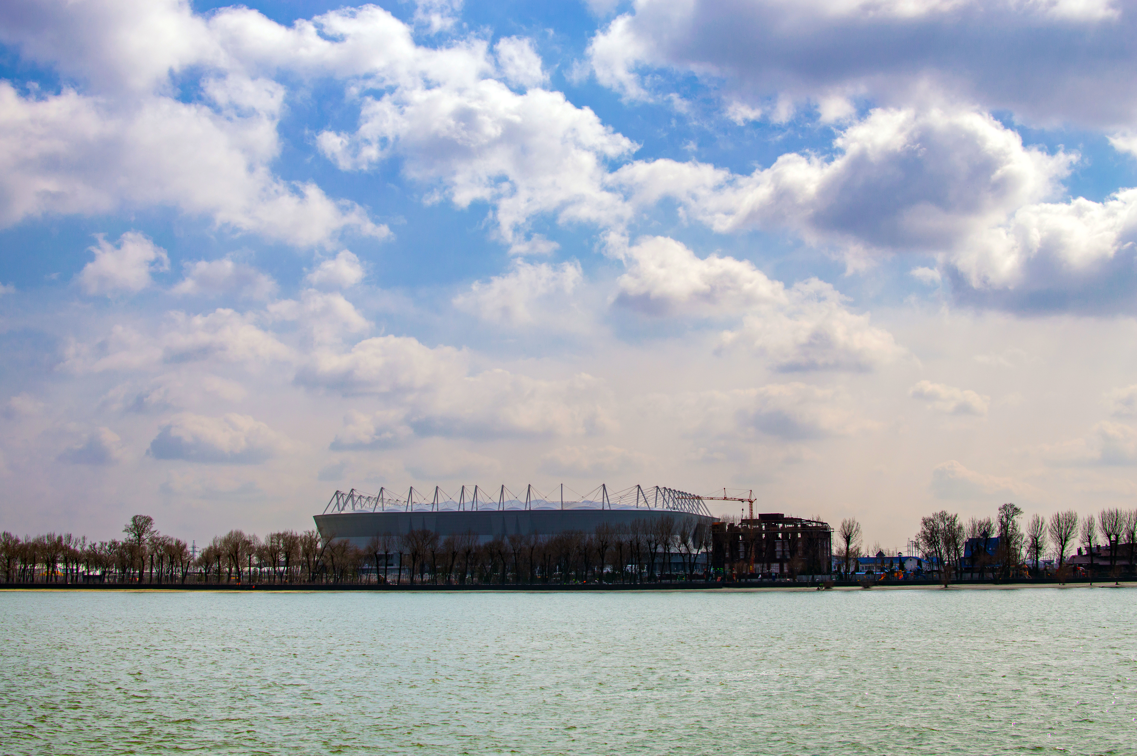 Этот снимок запечатлел монументальный футбольный стадион «Ростов Арена», расположенный в городе Ростов-на-Дону, Россия. Фотография была сделана 11 мая 2018 года, незадолго до начала Чемпионата мира по футболу FIFA 2018, для которого стадион и был построен. Величественное сооружение предстает на фоне обширного и живописного неба, украшенного пышными белыми облаками, которые контрастируют с голубой гладью.