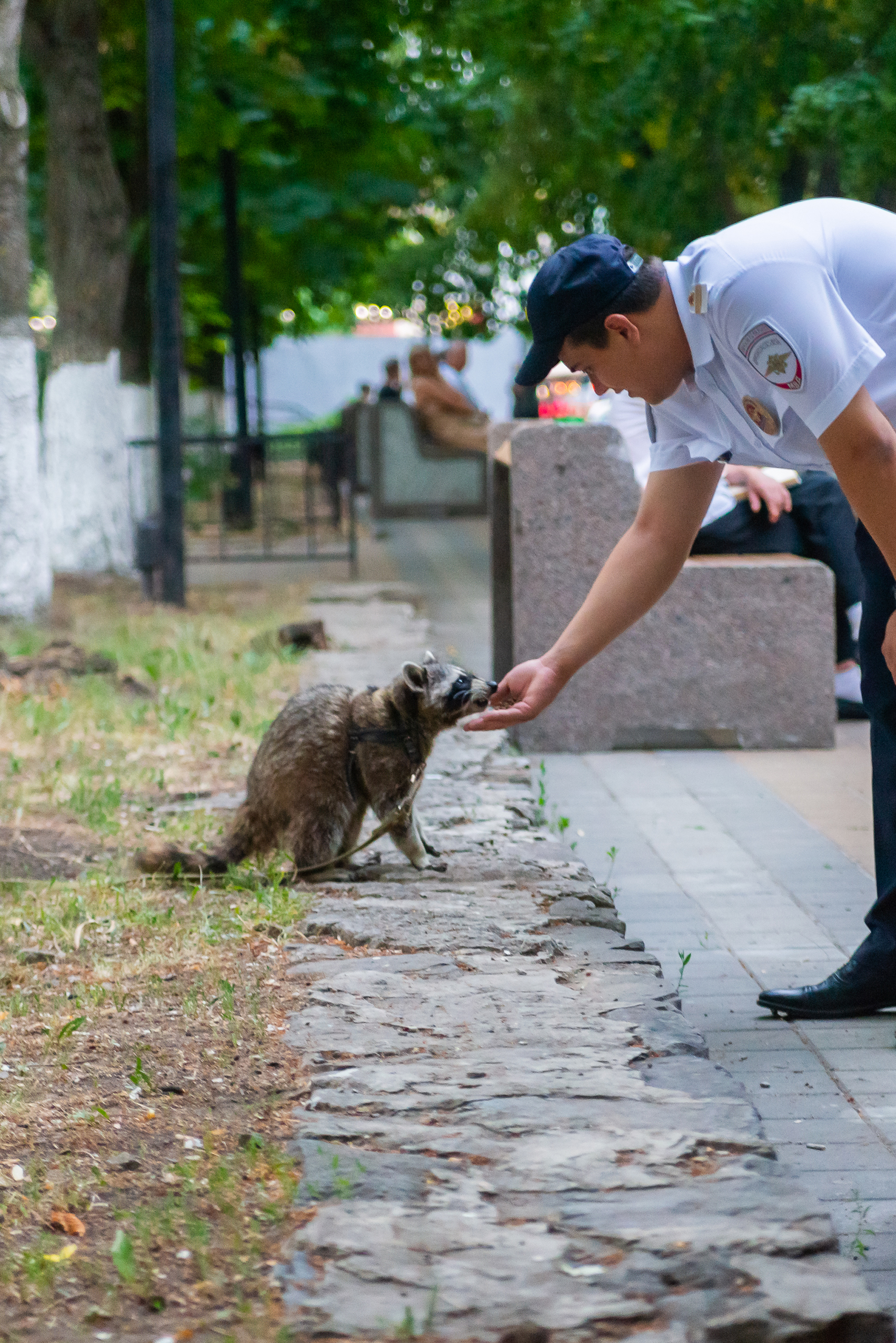 25 июня 2018 года в Ростове, в одном из живописных уголков Парка Горького, произошла встреча, полная доброты и неожиданности. Российский полицейский, одетый в форменную одежду, склонился, чтобы покормить дикого енота. Этот момент запечатлен на фотографии, передающей теплое летнее настроение и атмосферу спокойствия, царящую в парке.
