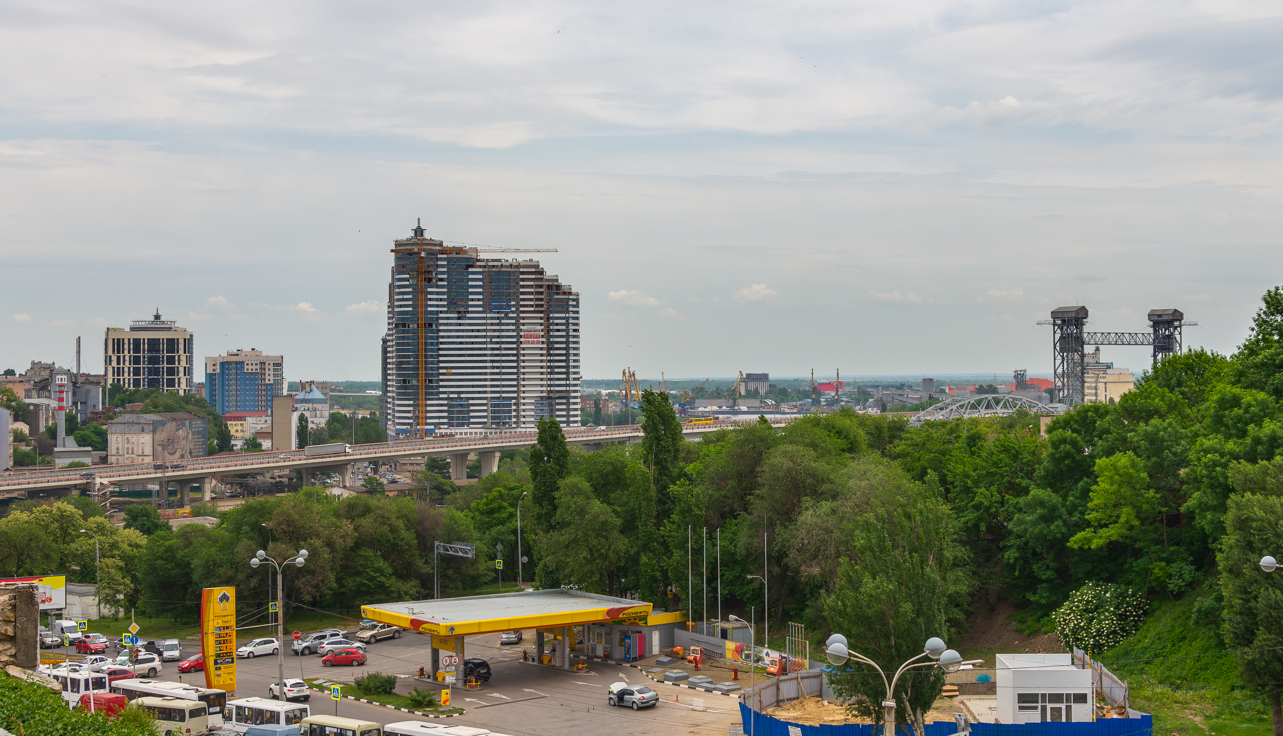 В центре композиции возвышается впечатляющее высотное здание, находящееся на стадии строительства, с его каркасом, устремленным к небу. Его современный дизайн с горизонтальными линиями и стеклянными фасадами резко контрастирует с более старыми зданиями, расположенными вдали. Широкое многоуровневое дорожное полотно с оживленным движением автомобилей пересекает пространство, соединяя различные части города. У подножия холма расположена автозаправочная станция с ярко-желтой крышей, служащая ярким цветовым акцентом на фоне зелени и серого асфальта. Множество автомобилей, включая автобусы, припаркованы и движутся, подчеркивая динамику городской жизни.