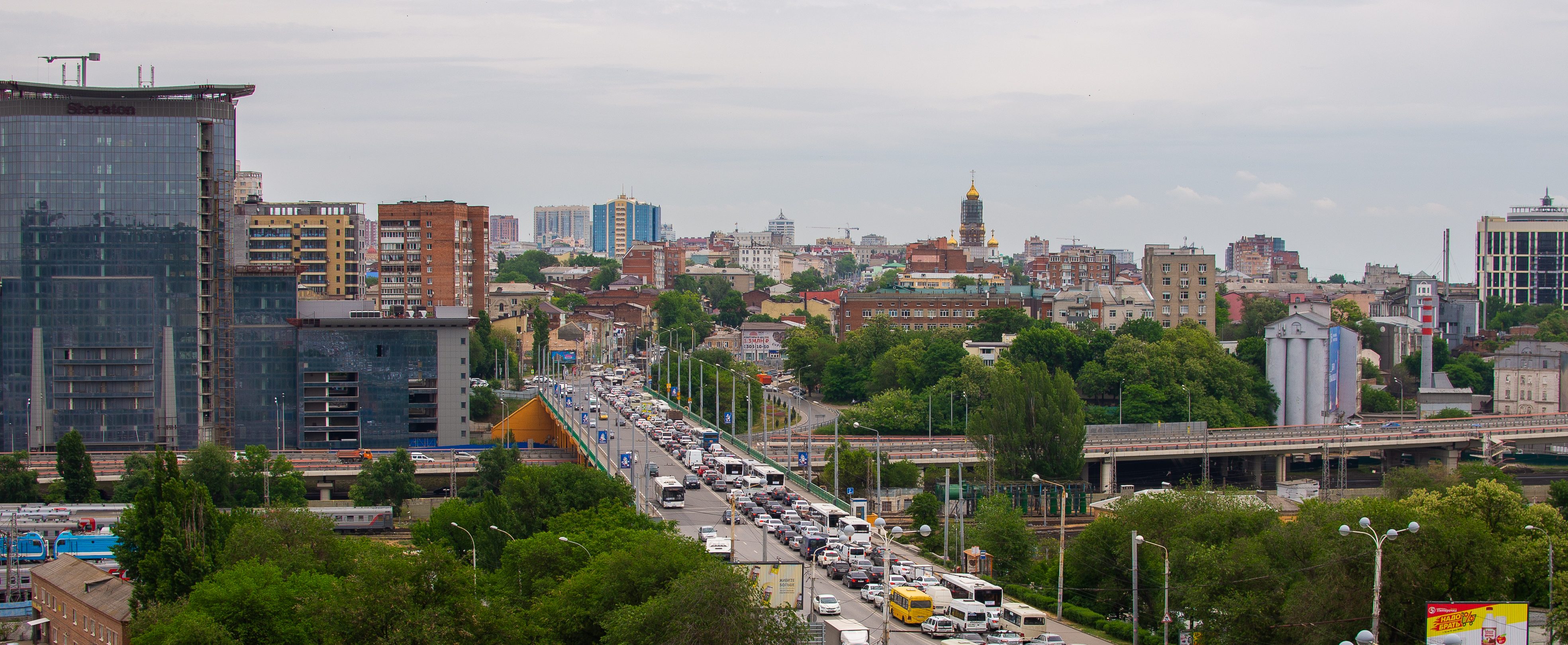 Вдали виднеются купола церквей, добавляющие духовности и узнаваемости Ростовскому облику. Облачное небо создает мягкое, рассеянное освещение, подчеркивая объем зданий и делая цвета более насыщенными. Несмотря на видимый транспортный коллапс на мосту, в целом снимок передает атмосферу живого, развивающегося города, полного энергии и движения. Это взгляд на Ростов, каким он был в середине мая 2018 года, запечатленный с высоты птичьего полета.