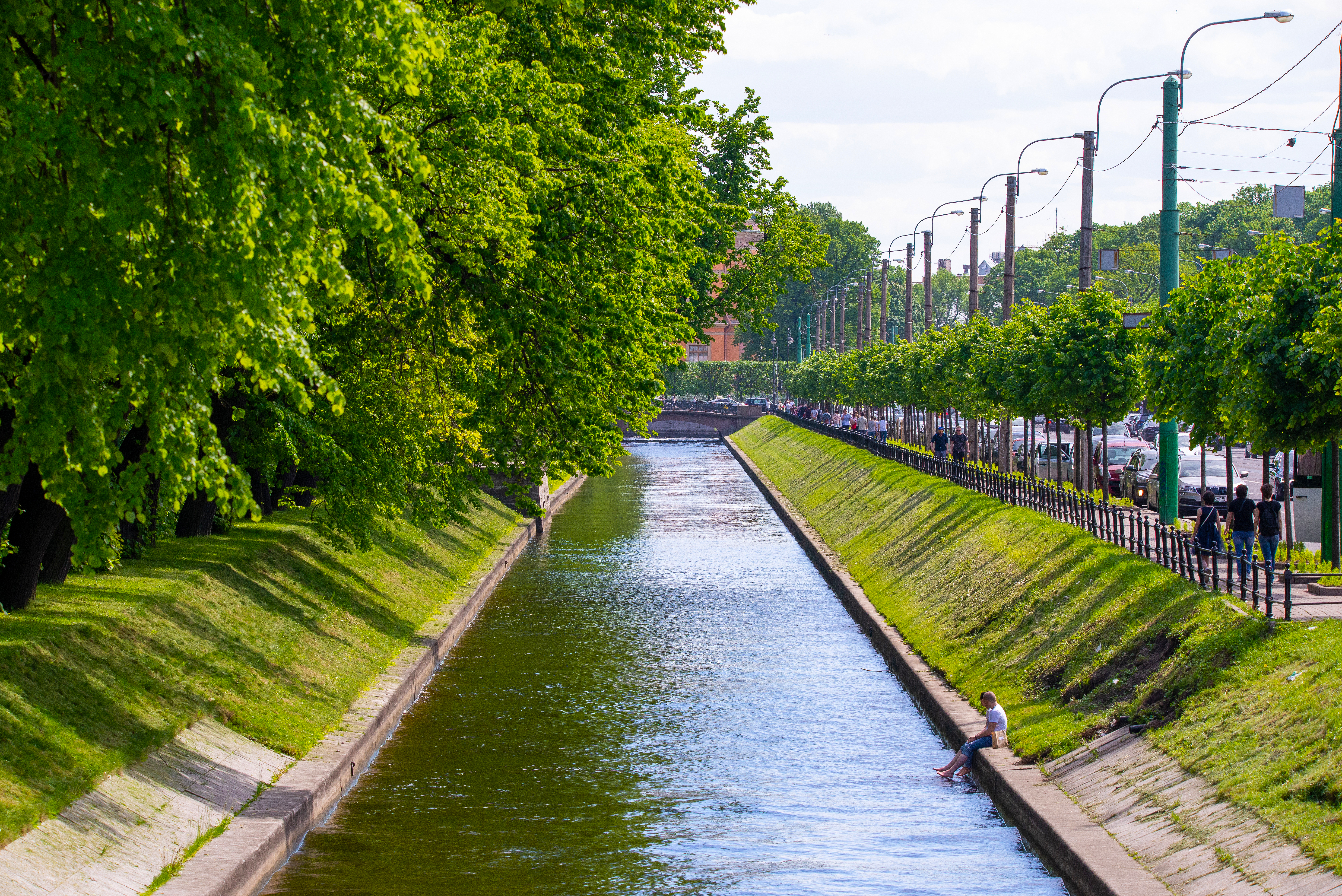 Летний вид на канал Грибоедова в Санкт-Петербурге. Зеленые деревья вдоль набережной, тихая вода и отдыхающие люди создают спокойную атмосферу.