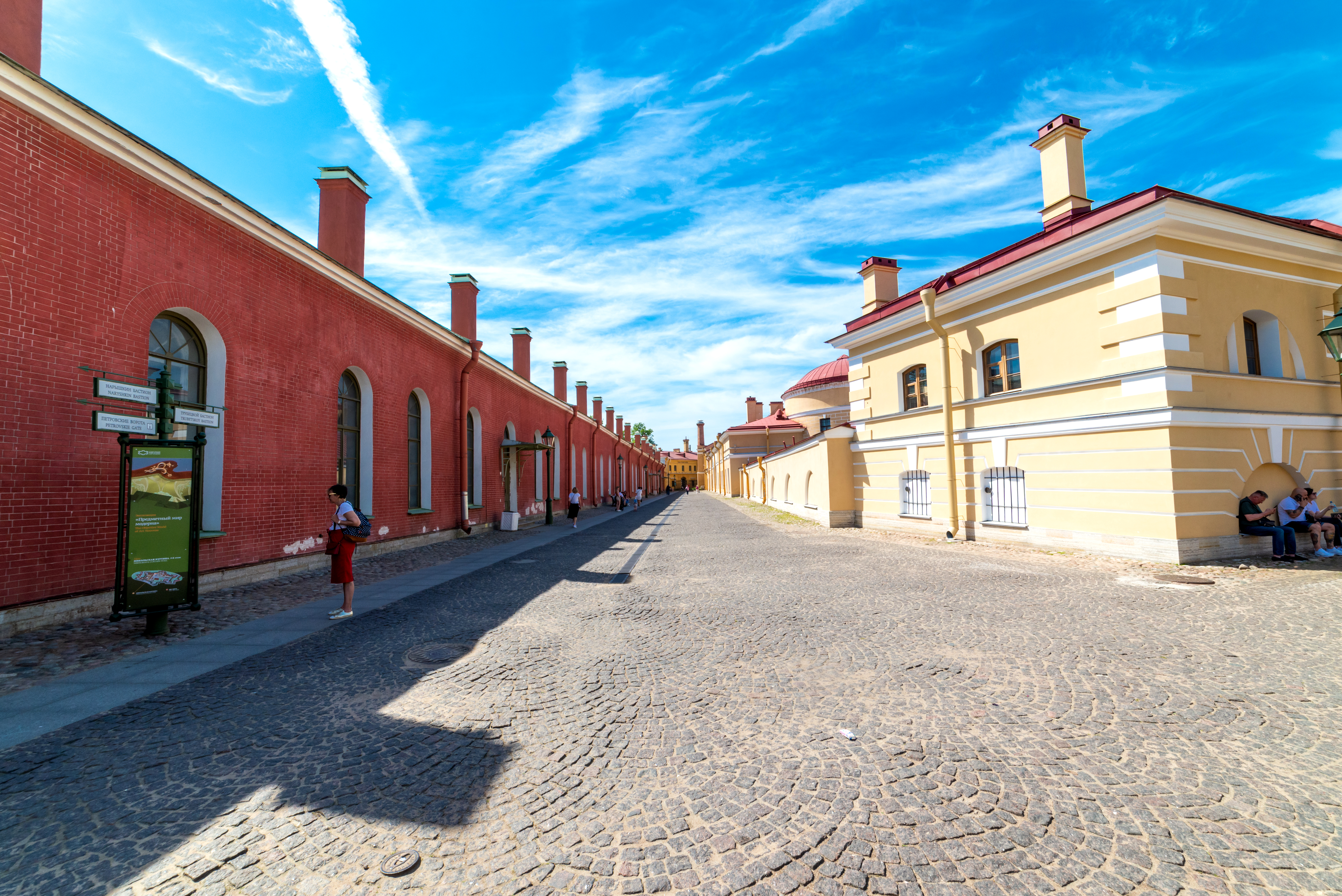 Солнечный летний день, 6 июня 2021 года, наполняет Петропавловскую крепость теплым светом и безмятежной атмосферой. Перед нами простирается мощеная булыжником улица, ведущая вглубь исторического комплекса. Яркое голубое небо, украшенное легкими белыми облаками, создает ощущение простора и свободы.