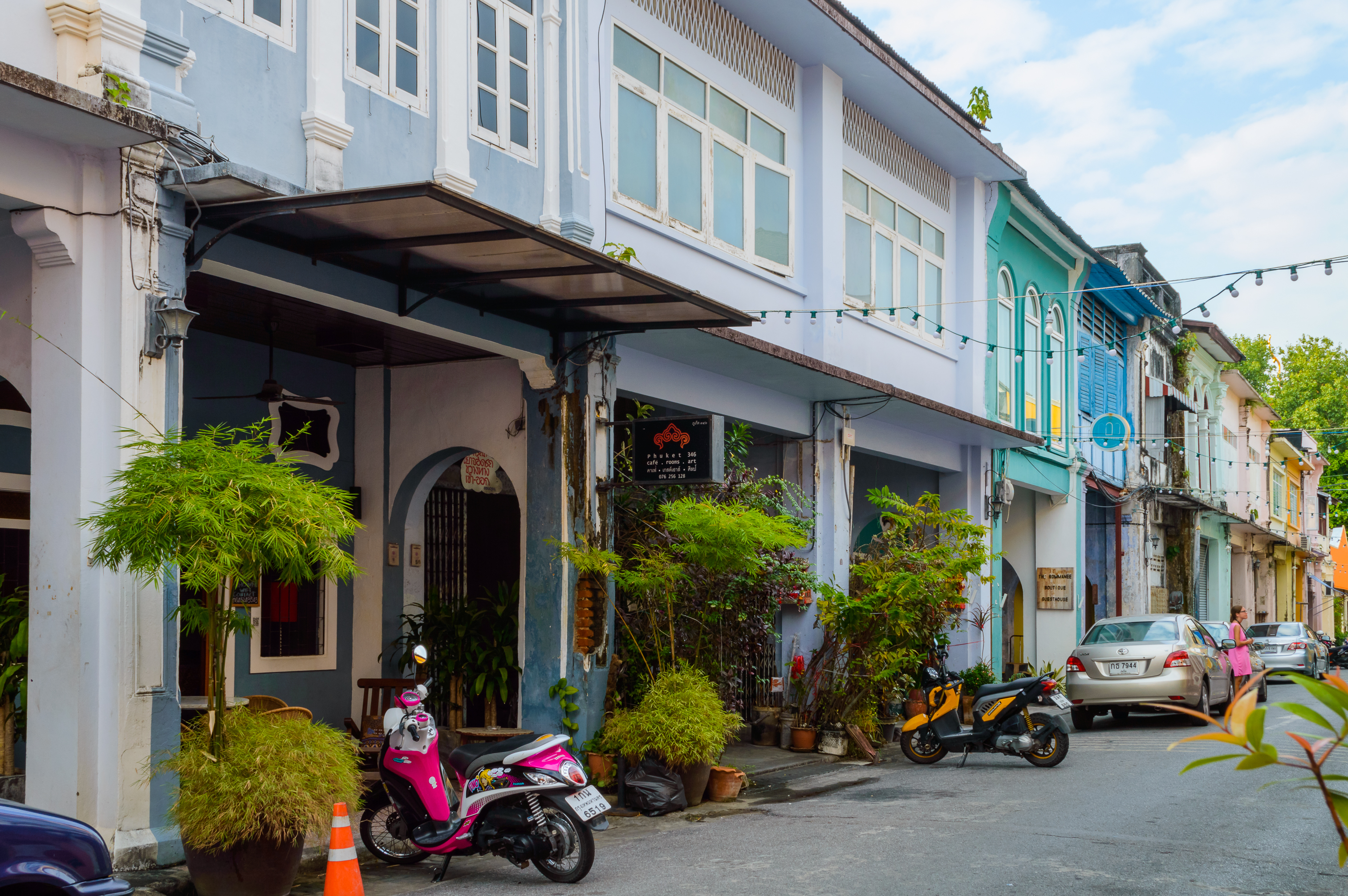 Добро пожаловать в сердце Пхукета, где оживает история! Это изображение переносит нас на оживленную улицу старого города, демонстрируя уникальное слияние архитектурных стилей и тропической атмосферы. Здания, окрашенные в нежные пастельные тона, такие как голубой, мятный и бледно-желтый, украшены элегантными окнами с ставнями и декоративными элементами, свидетельствующими о колониальном прошлом острова.
