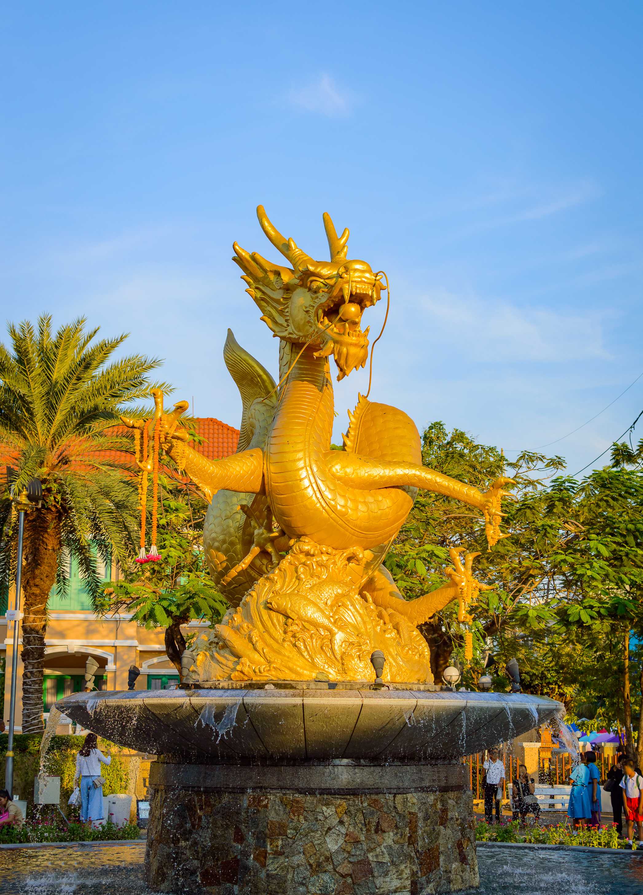 The sunlight, characteristic of the tropical weather, illuminates the golden surface of the dragon, highlighting every scale and curve of its powerful body. The statue is mounted on a fountain, which adds dynamism to the composition, creating a sense of movement and life. The water flowing over the edges of the fountain reflects the bright golden hue of the dragon, enhancing its radiance.