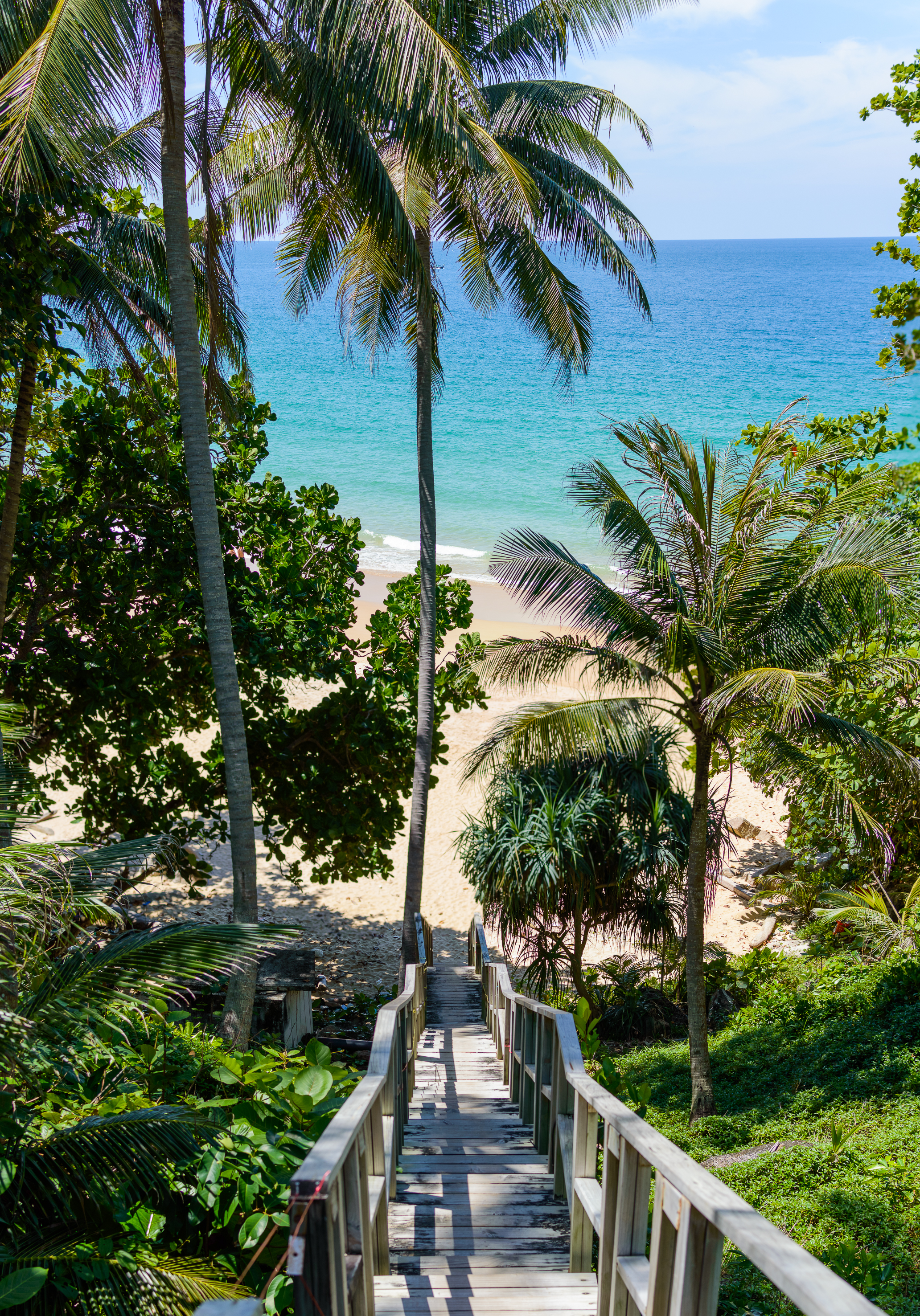 Старая деревянная лестница, ведущая к пляжу, окруженная пальмами. Пляж Найтон, Пхукет, Таиланд.