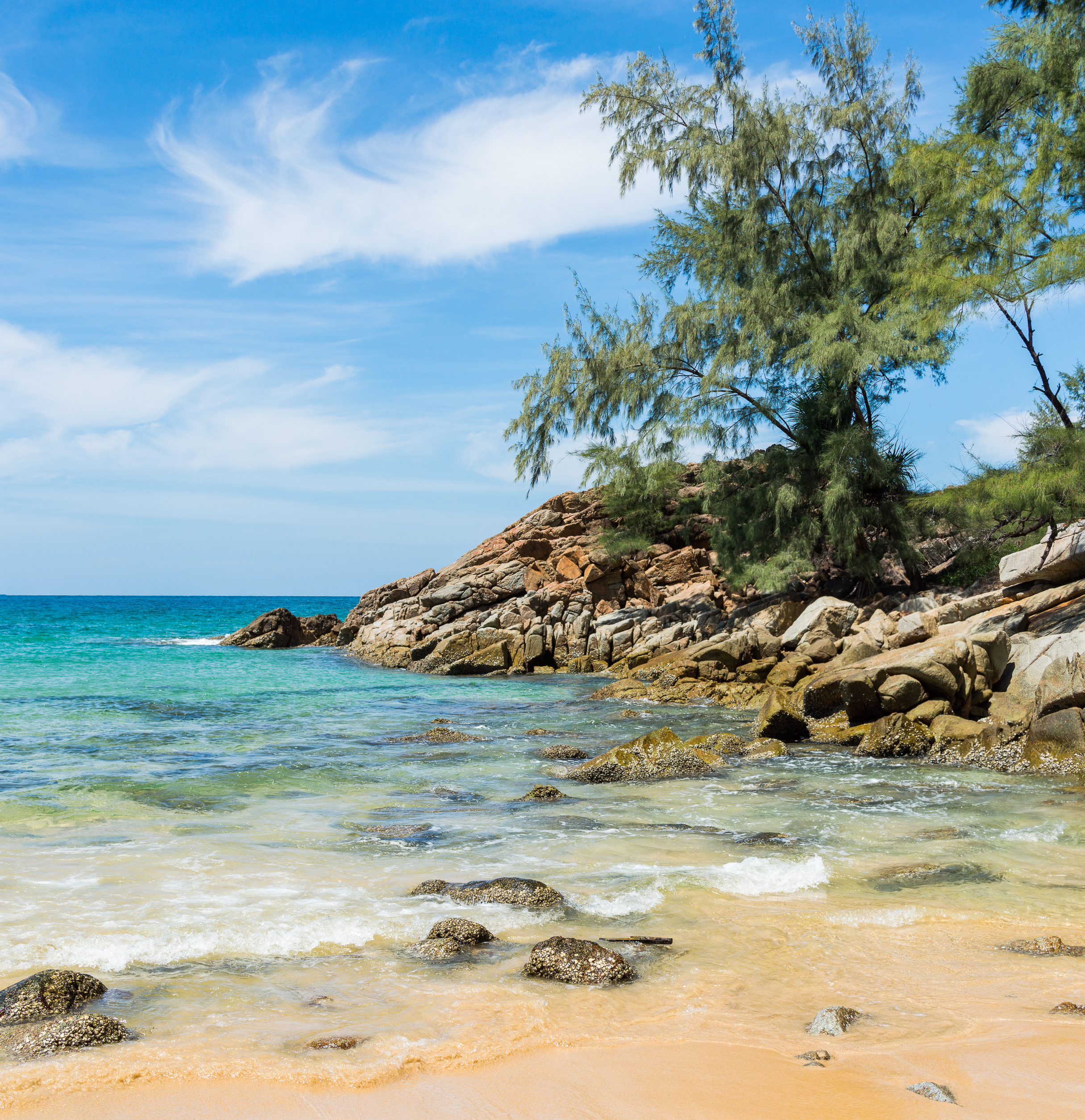 Пляж Найтон на острове Пхукет, Таиланд. Скалы и деревья.