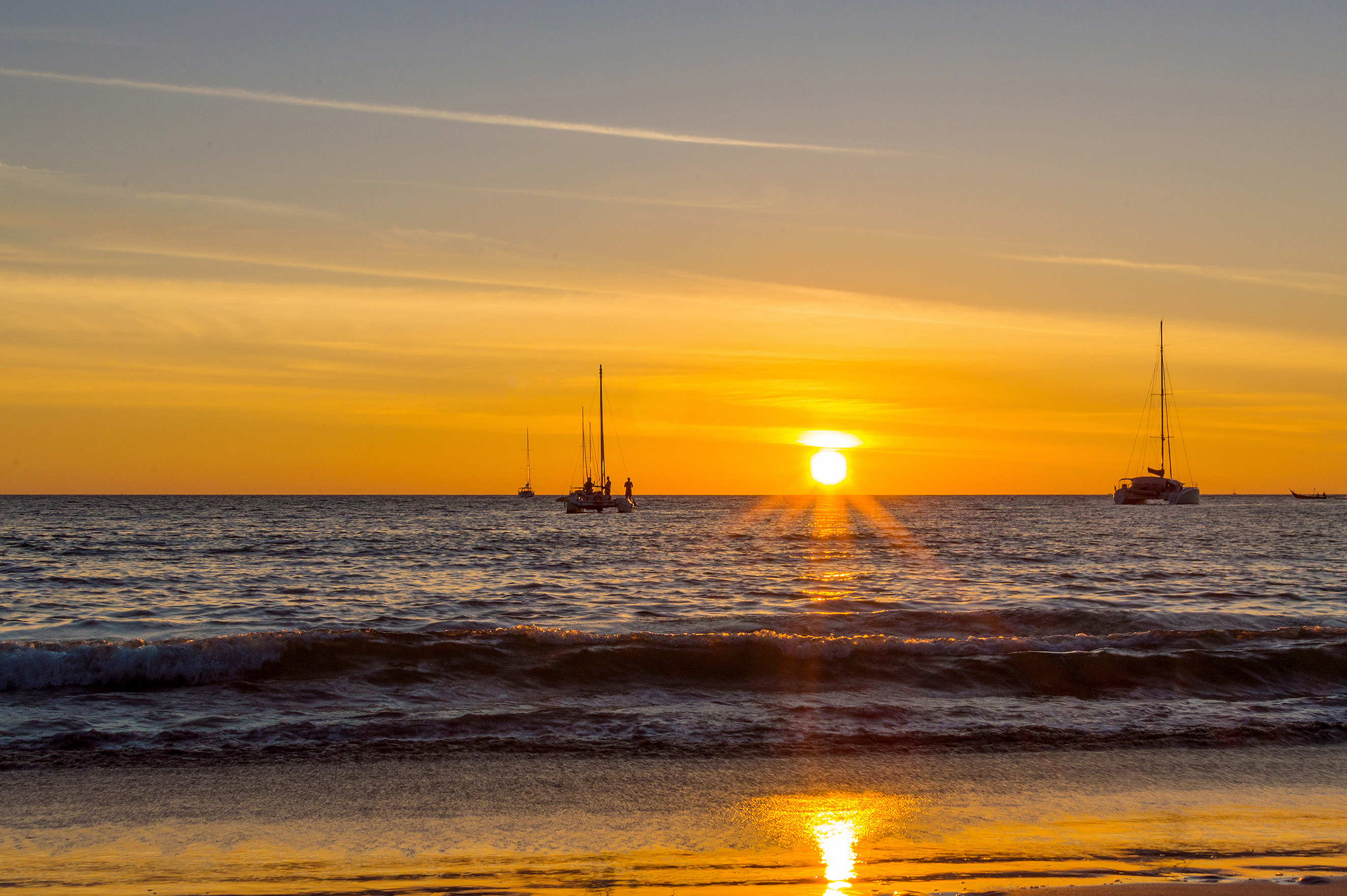 Красочный закат с силуэтом парусника и яхт на переднем плане в золотой час и спокойное море в тропиках.