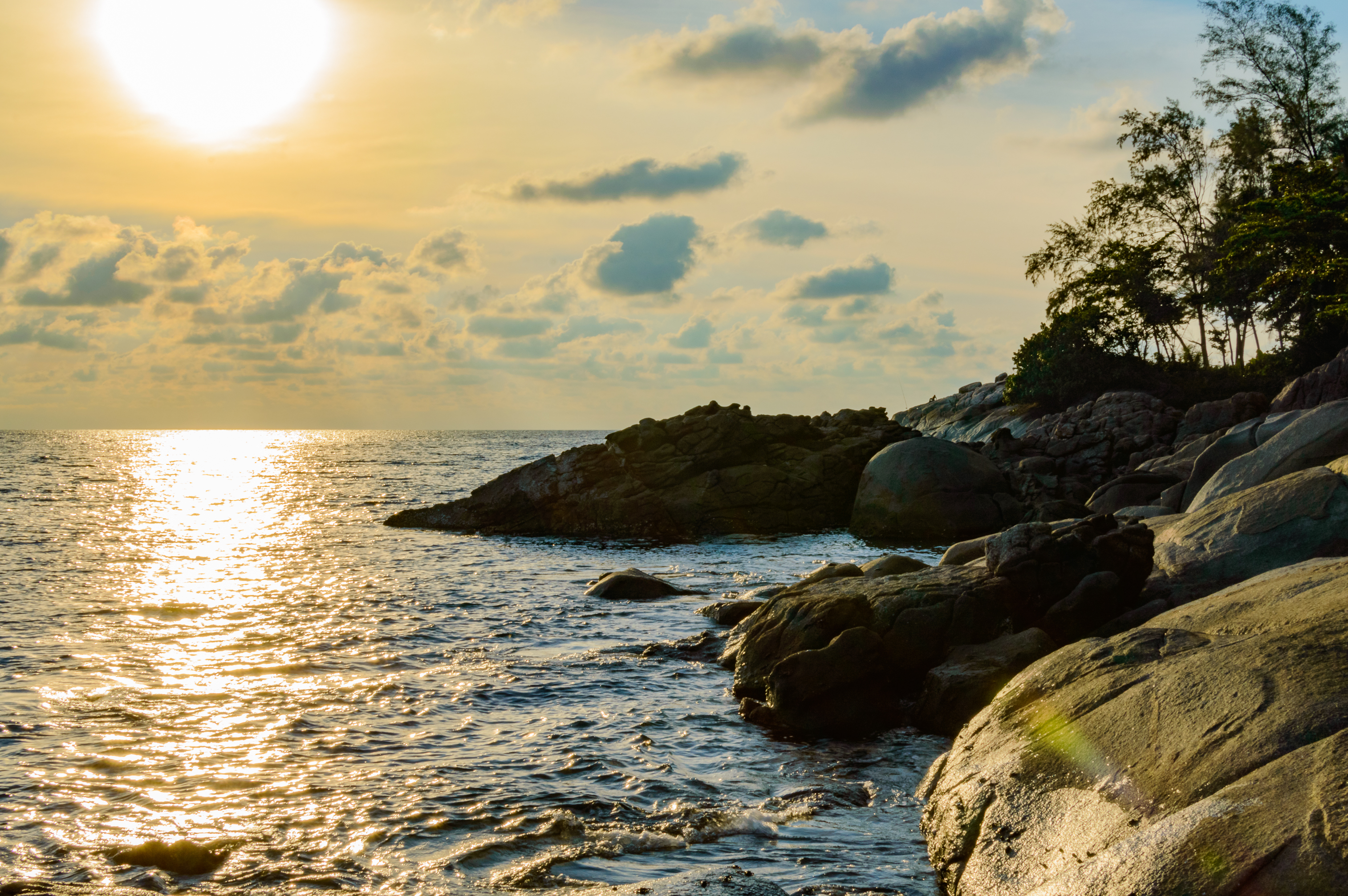 Золотистый живописный восход и закат над морем или океанскими волнами