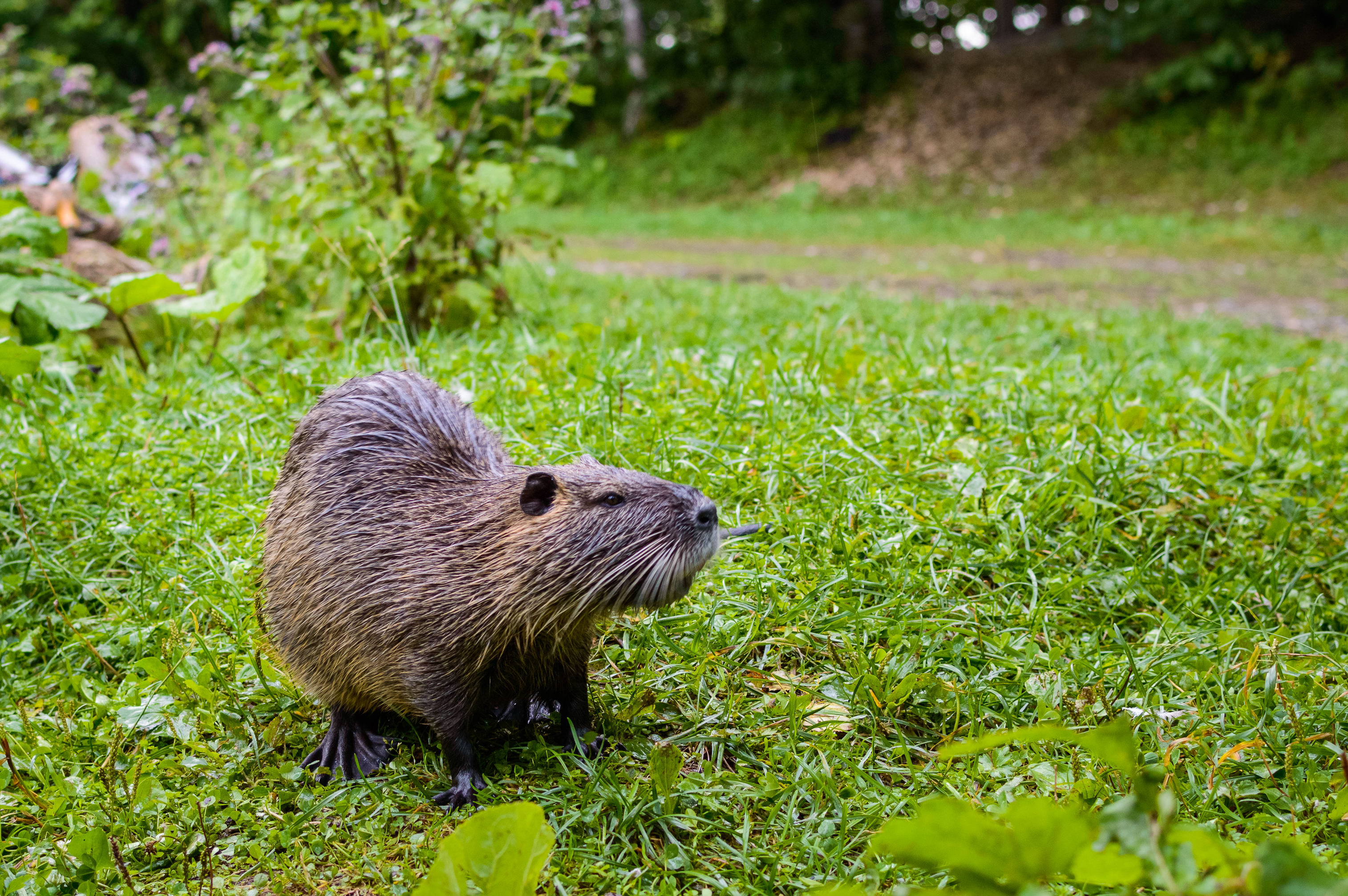 Водяная крыса (нутрия) на зеленой траве, близкое знакомство с природой