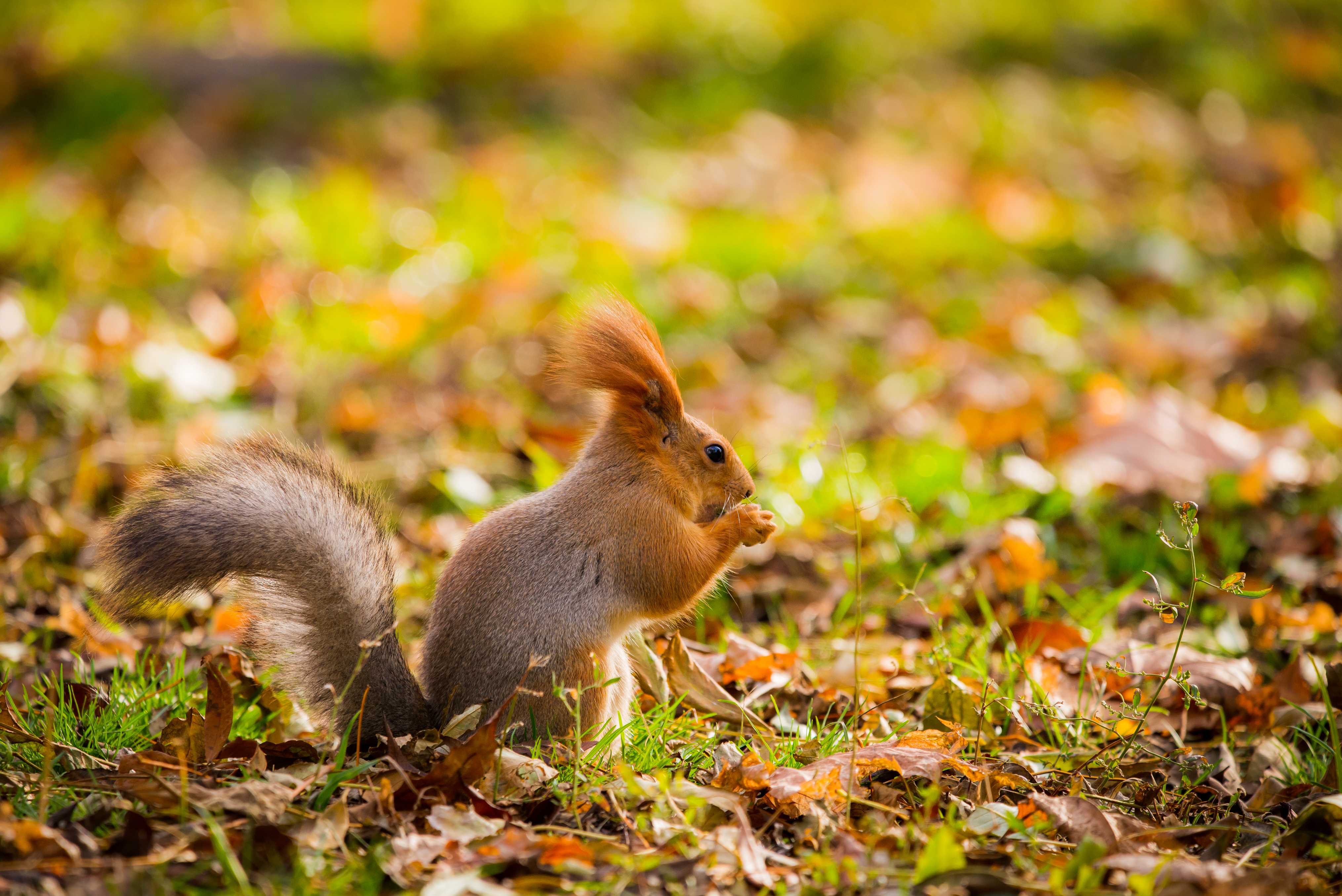 Крупный план рыжей белки, сидящей на траве среди опавших осенних листьев и поедающей орешек. Мягкий фокус и теплые осенние цвета создают уютную атмосферу.