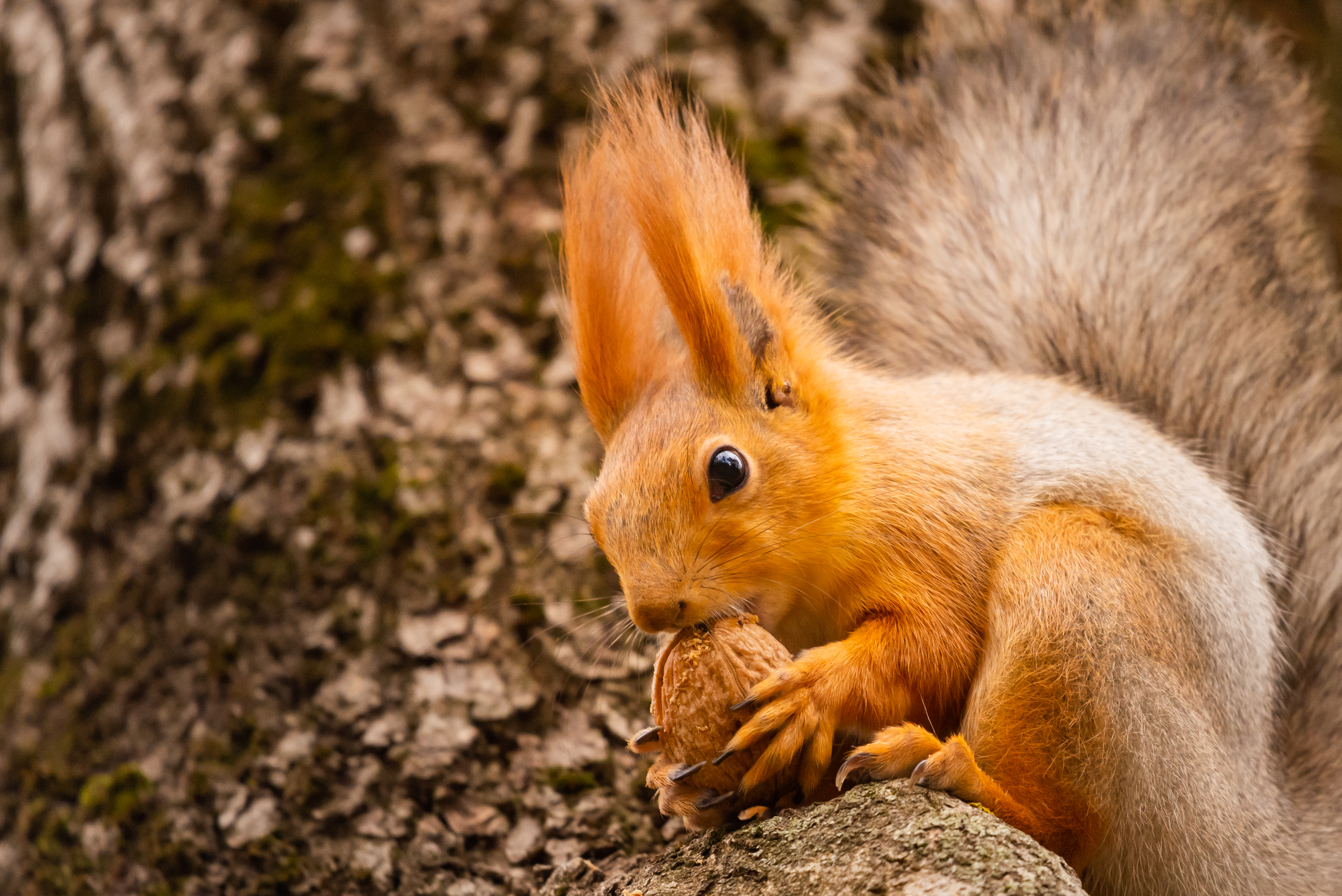 Крупный план рыжей белки, которая сидит на ветке дерева и держит в лапах орех, готовясь его съесть. Пушистый хвост и острые ушки создают милый образ.