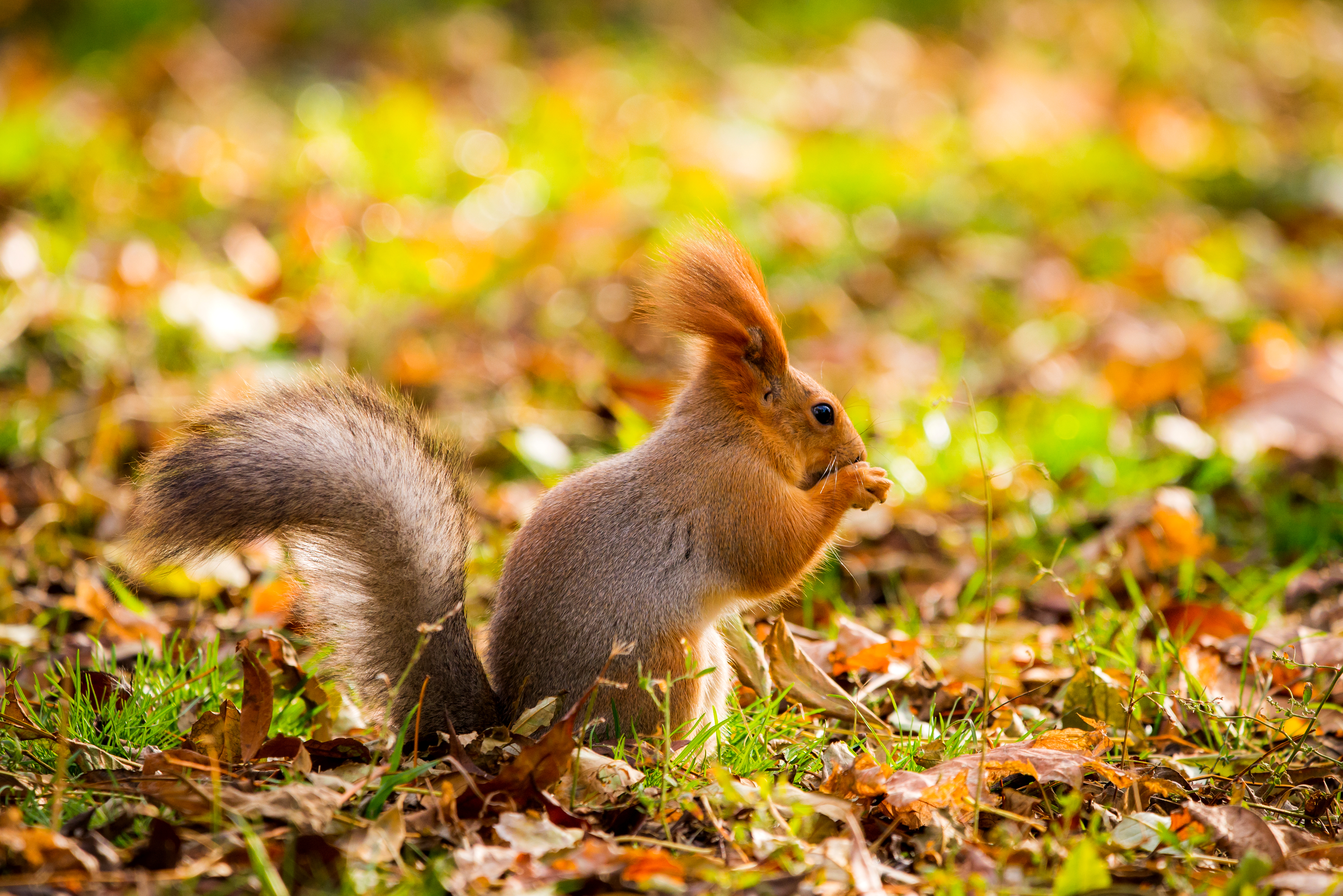 Рыжая белка с пушистым хвостом сидит на лесной подстилке, усыпанной опавшими осенними листьями, и ест. Мягкий солнечный свет освещает сцену, создавая теплую атмосферу.