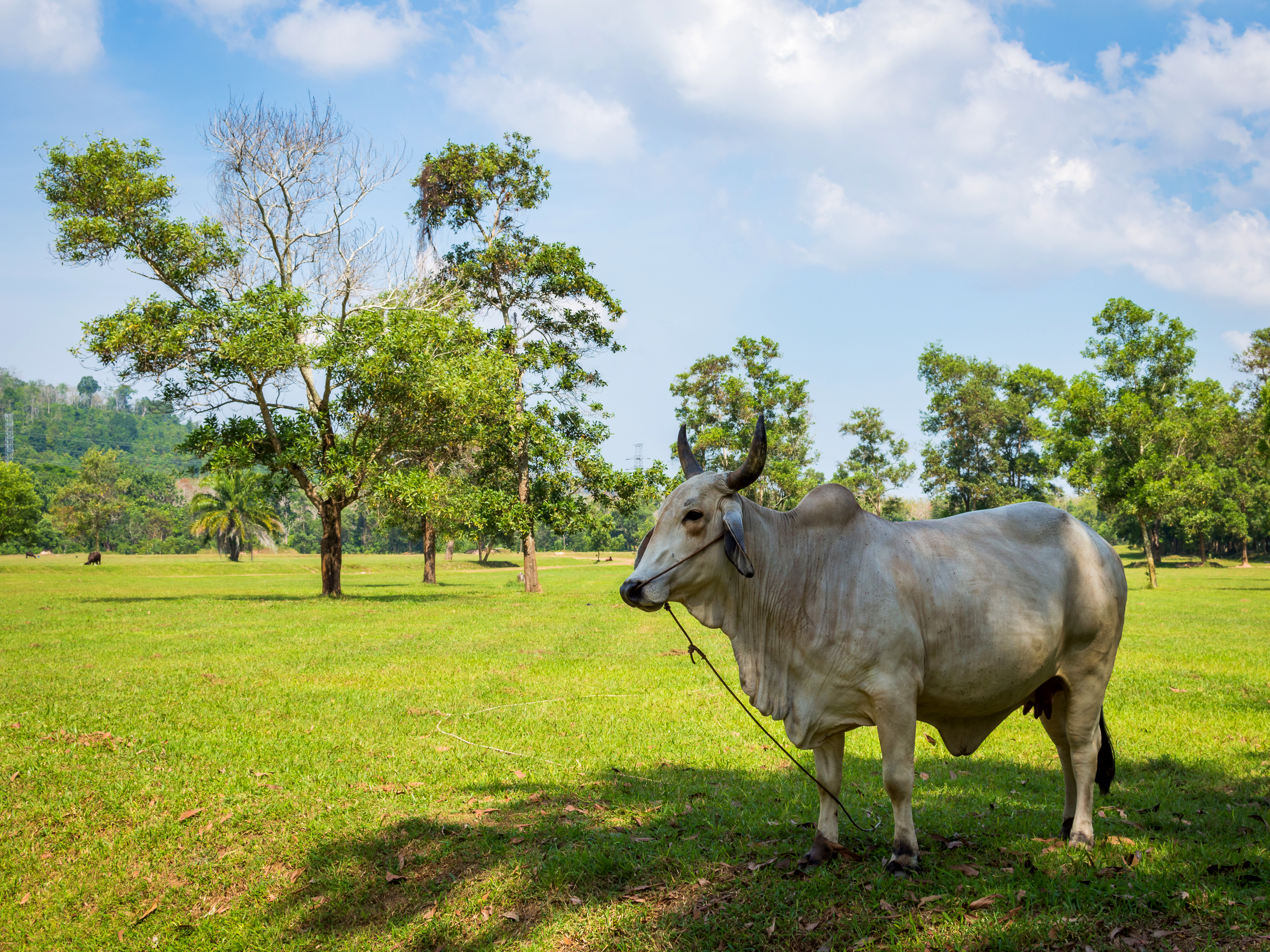 Белая корова пасется на свежем зеленом поле.